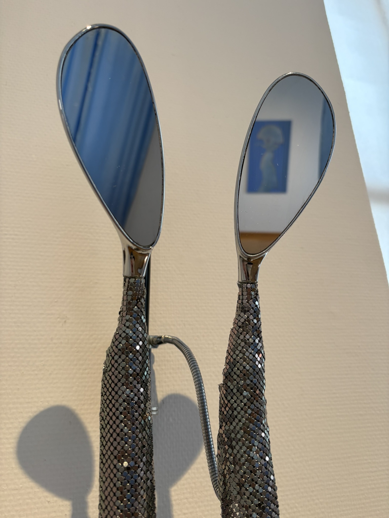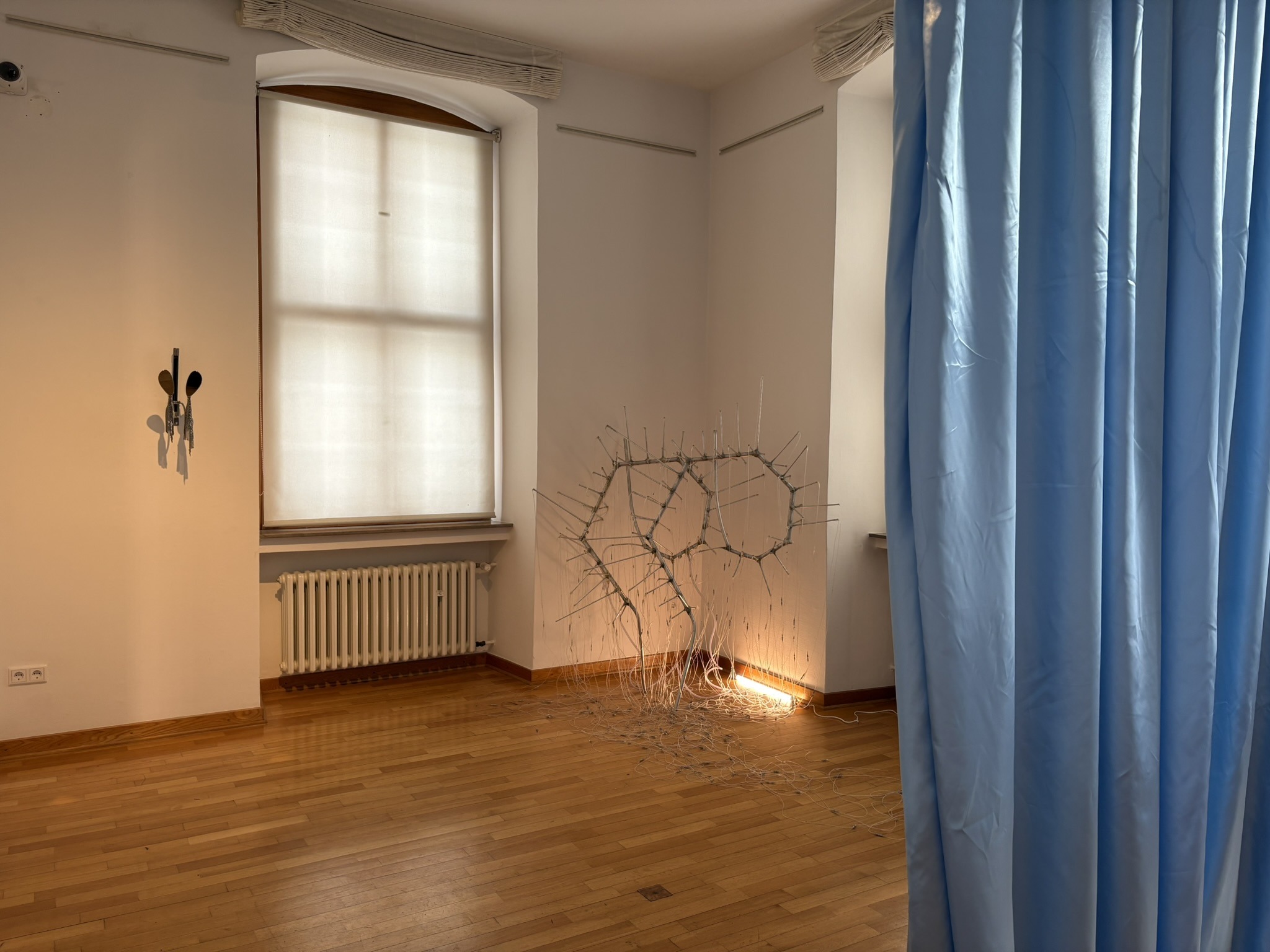 Karo Schultz präsentierte Werke aus den verschiedensten Materialien wie beispielsweise Vorhangstangen, Rückspiegel, Infusionsschläuche, Wasserpumpen, Haarbürsten oder Aluminium, die sie zum Bau ihrer kinetisch technoiden Installationen wählte.